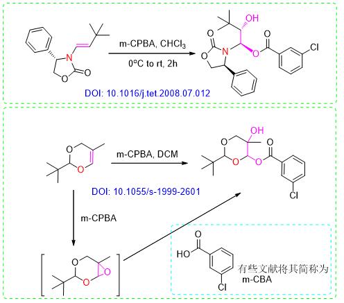 間氯過氧苯甲酸(m-CPBA)是一種良好的親電試劑。能和許多官能團發(fā)生反應,可以氧化烯烴、烯醇硅醚、呋喃、硫化物、硒化物和氨基化合物等。
